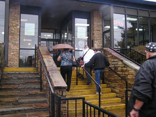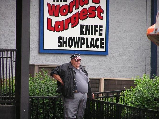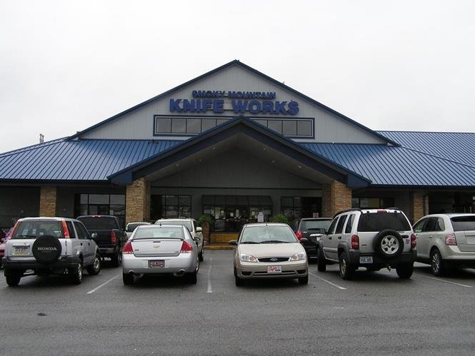 The gang enters Smoky Mountain Knife Works.